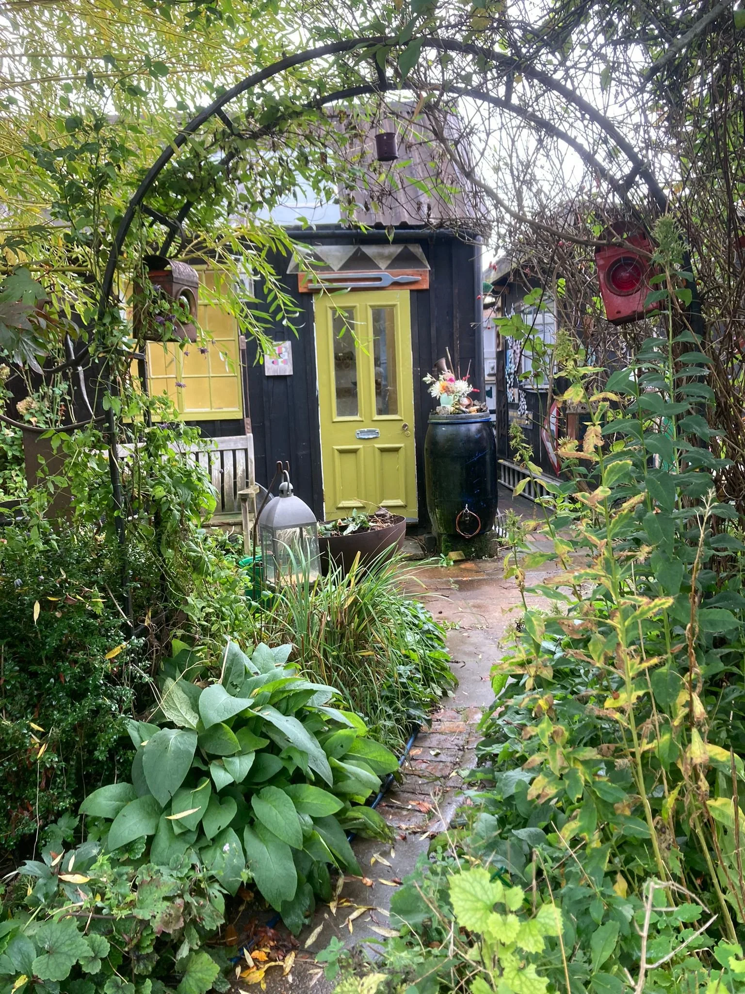 Tucked away at the bottom of Jo’s beautiful garden, created over many years in Alton Hampshire, is the Sound Studio, built by Richard from a locally felled Sequoia tree and re-claimed windows and doors.. It is one of those places that could be anywhere in the world an oasis in a small market town..